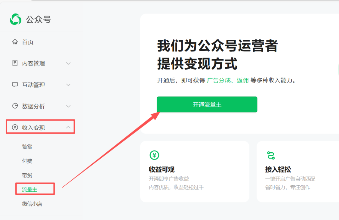 第二种方式:电脑端开通,登录【微信公众号平台】,进“收入变现”栏点“流量主”,最后在“广告管理”里把开关全打开即可。