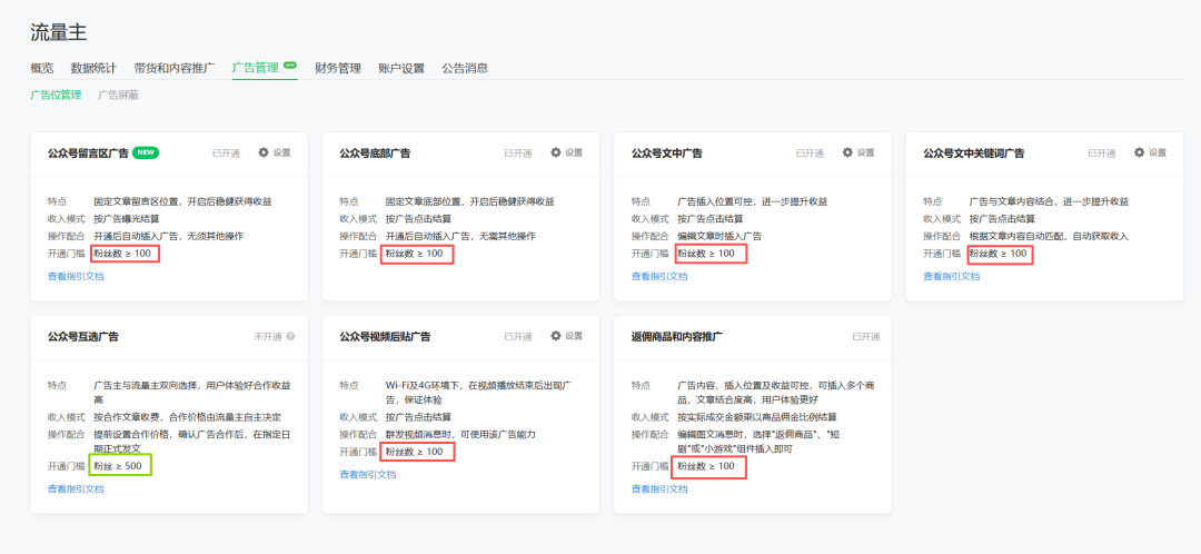 以前公众号要熬到500个粉才能解锁的广告位,现在过百粉就能全部拿下。